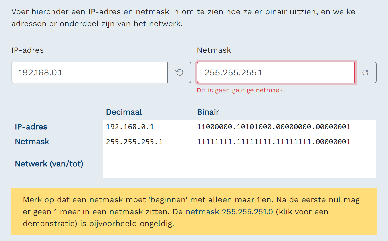 Door het IP-adres en/of de netmask te wijzigen, wordt snel duidelijk wat ze met elkaar te maken hebben. Voer je een ongeldige netmask in, dan wordt dat aangegeven en leggen we uit wat er aan de hand is: