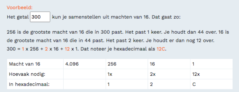 In deze paragraaf leren de leerlingen wat hexadecimale getallen zijn. Onze ervaring is dat het altijd even duurt voordat bij een leerling 'het kwartje gevallen is' wat betreft de werking van hexadecimale getallen. Dit interactieve element, met een duidelijke uitleg, gaat ze daar zeker bij helpen!