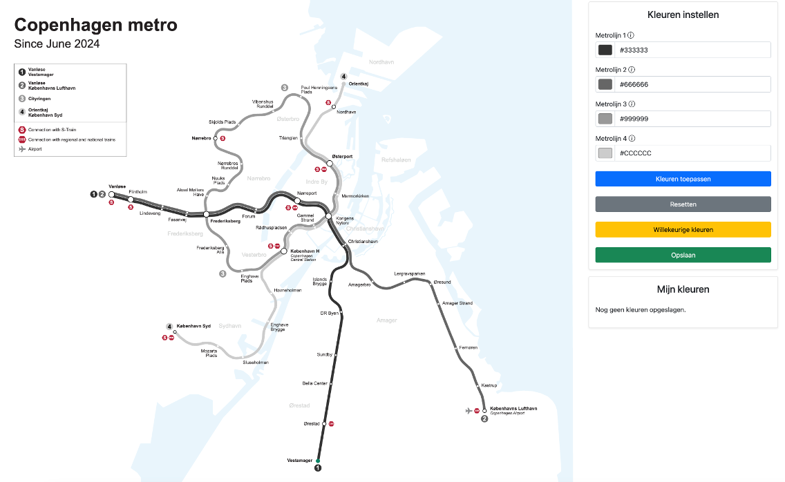 Vervolgens deden we een praktische oefening: het kiezen van kleuren voor een metrokaart. Kleuren moeten niet alleen mooi bij elkaar passen, ze moeten ook duidelijk van elkaar te onderscheiden zijn.