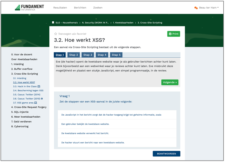 Op dit moment is het onderdeel "Kwetsbaarheden (N1)" beschikbaar, waar zo’n 10 à 20 SLU aan besteed kan worden, afhankelijk van welke keuzes jij als docent maakt. De komende weken zullen de andere drie onderdelen volgen, evenals een studieplanner en toetsvragen.